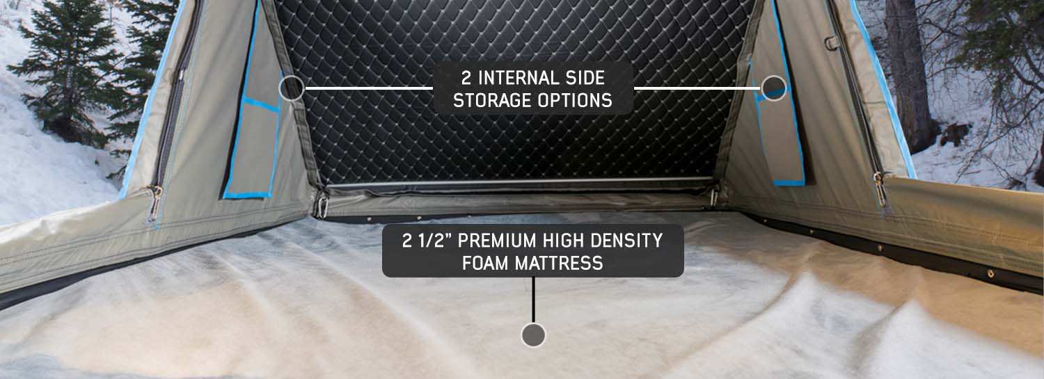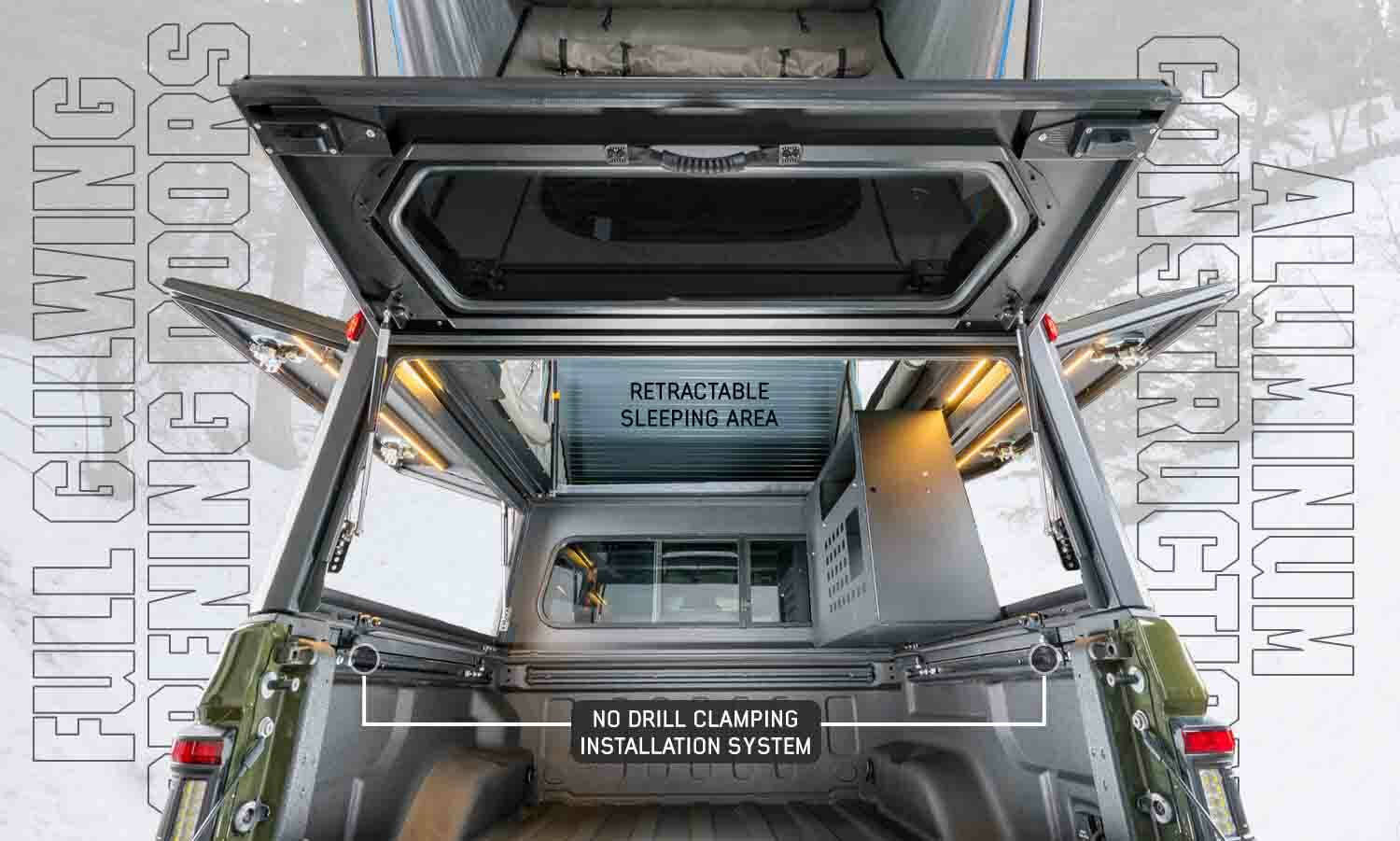 Secure Interior Space inside the camper shell for gear storage, cooking setups, or sleeping platforms